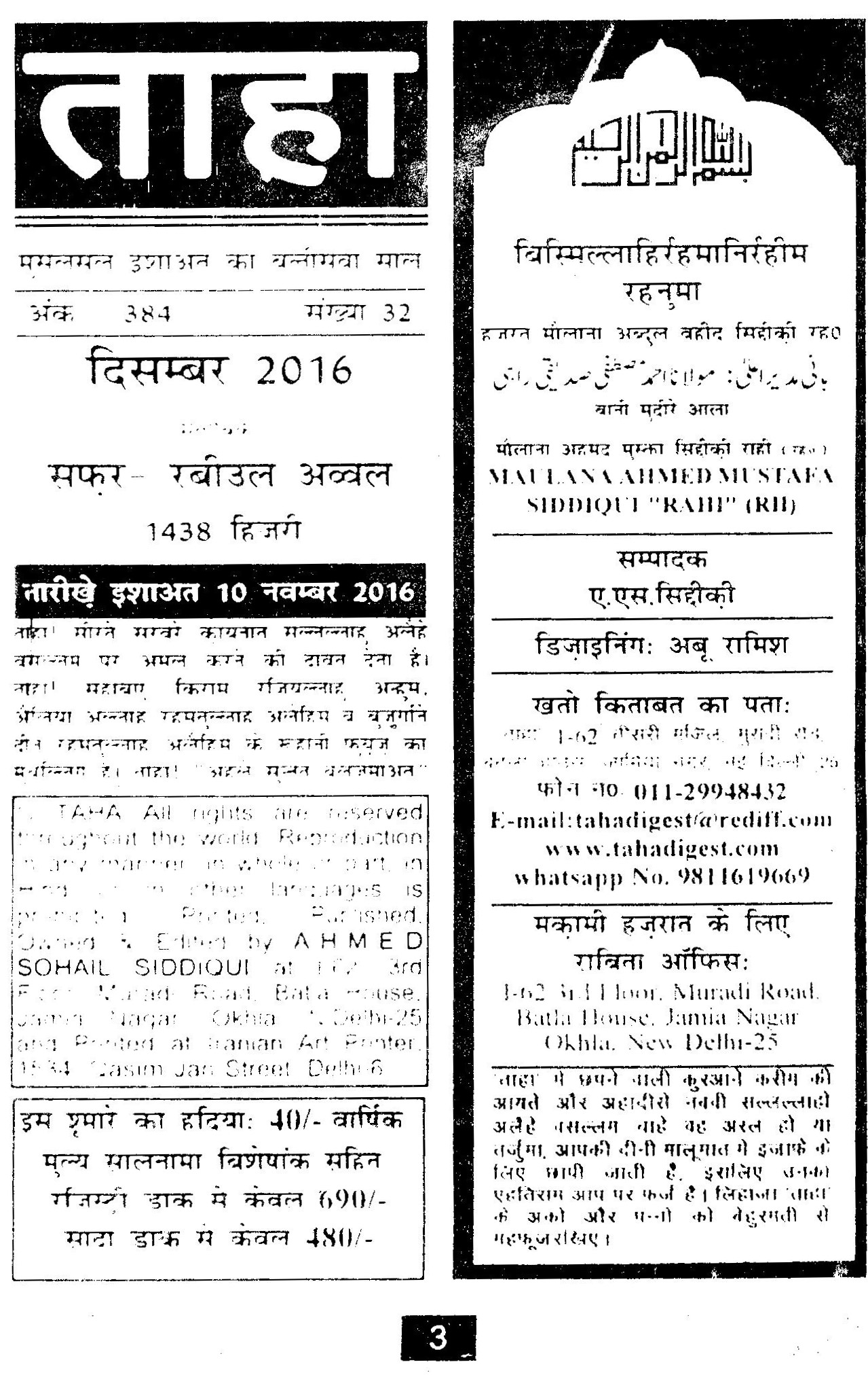Taha Islamic Digest : December 2016 – Special Issue / Aksey Sirat Number : Safar ul Muzaffar / Rabiul Awwal – 1438 Hijri.