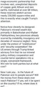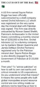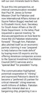 अनेक रिपोर्टों में खुलासा हुआ है कि भारतीय और अमेरिकी खनन कंपनियाँ अफगानिस्तान में संयुक्त खनन परियोजनाएँ शुरू करने जा रही हैं। तालिबान नेतृत्व, अंतरराष्ट्रीय वैधता की खोज में, उन्हीं कॉर्पोरेट और सैन्य समूहों के साथ समझौते कर रहा है जिन्होंने पाकिस्तान की छवि को विश्व स्तर पर कलंकित किया।